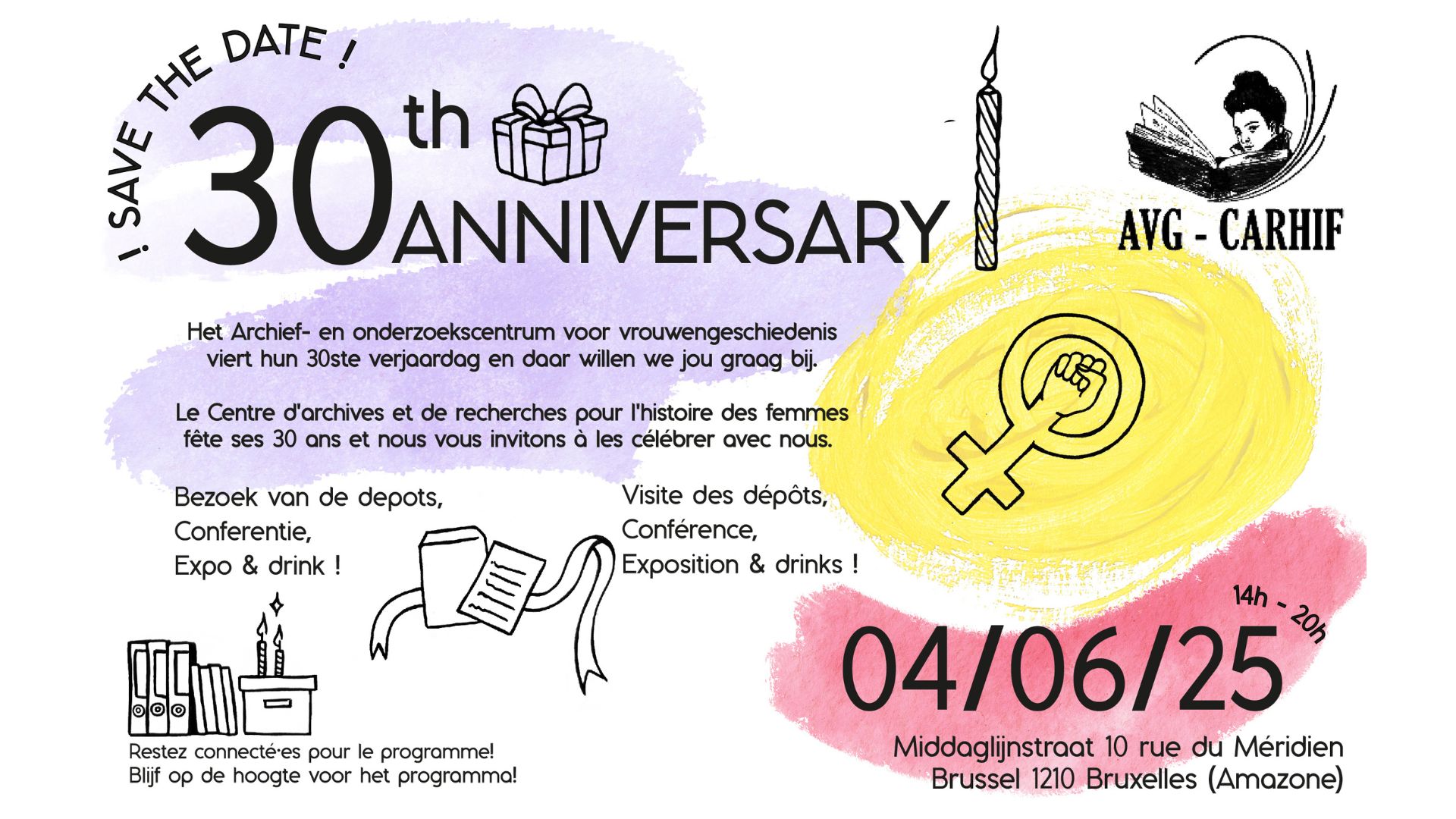 In 2025 viert het AVG 30 jaar werking. Ter gelegenheid van die verjaardag nodigen we je graag uit voor een feestelijke namiddag op woensdag 4 juni van 14u tot 20u. Op het programma staat een bezoek aan het AVG (onze leeszaal en – uitzonderlijk – ook het archiefdepot), een rondetafelgesprek over het ontstaan en het belang van archiefcentra die zich specifiek toeleggen op erfgoed in verband met vrouwen-, gender- en seksualiteitsgeschiedenis en een gezellige drink om bij te praten en onze 30ste verjaardag te vieren. We bereiden ook een kleine tentoonstelling voor met impressies uit onze collecties en de vrouwengeschiedenis van België. De expo zal te bezichtigen zijn vanaf 27 mei tot eind juni 2025. Binnenkort volgt het volledige programma!