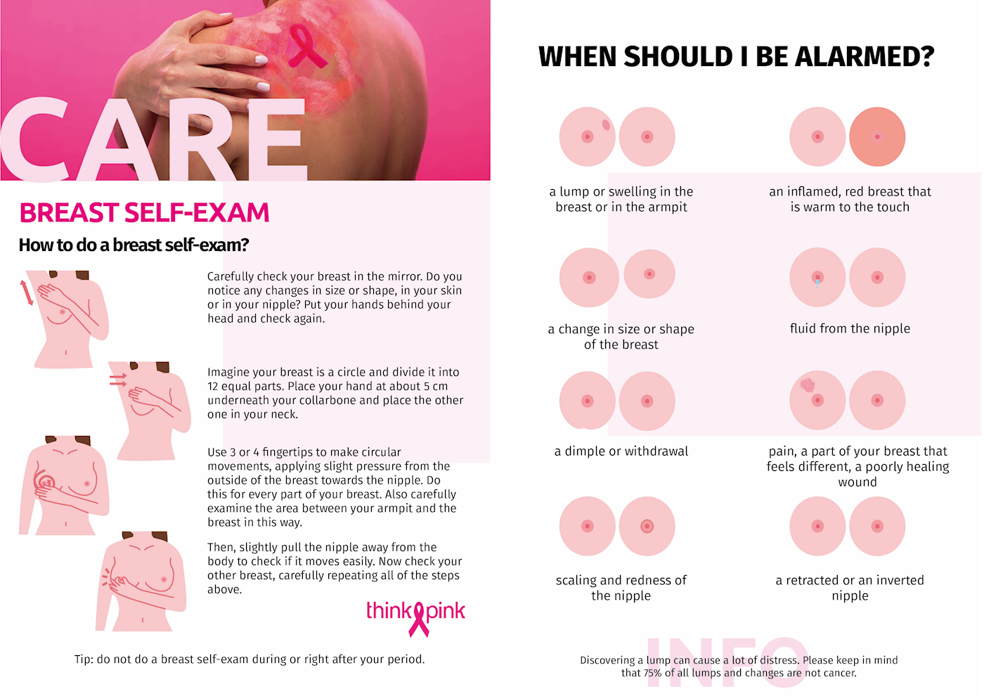 Each year, 1.5 million people in Flanders receive an invitation for a free preventive breast cancer screening – available once every two years. Around 70% of invitees take part. In addition, regularly checking your own breasts can help detecting changes early on. ThinkPink, the leading breast cancer organization in Belgium and elsewhere, developed a breast self-exam guide to help you recognize warning signs: