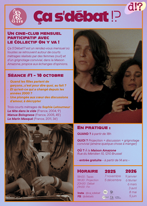 Le Ciné-Club Ca S’Débat!? est un rendez-vous mensuel de discussions et de partage entre très jeunes, jeunes et moins jeunes autour de courts métrages de réalisatrices (yes!) et d’un repas partagé selon le concept d’auberge espagnole chez Amazone, qui offre un espace safe pour que puissent circuler et se rencontrer des opinions et ressentis des plus cringe aux plus normé·es (et pourquoi pas?).