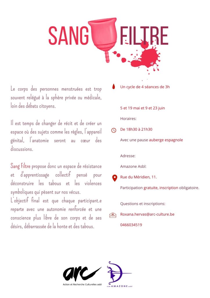 C’est ce chemin que prendra Sang Filtre, un cycle d’ateliers ouvert à toutes les personnes menstruées. La participation est gratuite et le catering sera assuré en mode auberge espagnole, c’est pourquoi nous vous demandons de nous préciser, lors de votre inscription, ce que vous apporterez.