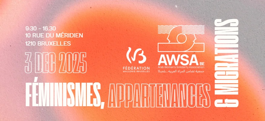 Mercredi 3 décembre, AWSA-Be a le plaisir de vous inviter à une journée de présentation de nos études 2024. Cette rencontre est l’occasion de croiser les regards sur les féminismes situés, les parcours migratoires et la gestions des appartenance multiples. La matinée sera consacrée à une table ronde en présence des autrices Noura Amer, Alyssa Ahrabare et Pamela Moussallem, aux côtés de l’équipe d’AWSA-Be, afin d’approfondir les sujets développés dans leurs études. L’après-midi, vous pourrez participer à l’un des trois ateliers animés par nos invitées et l’équipe d’AWSA-Be, pour prolonger les échanges de manière participative et concrète.