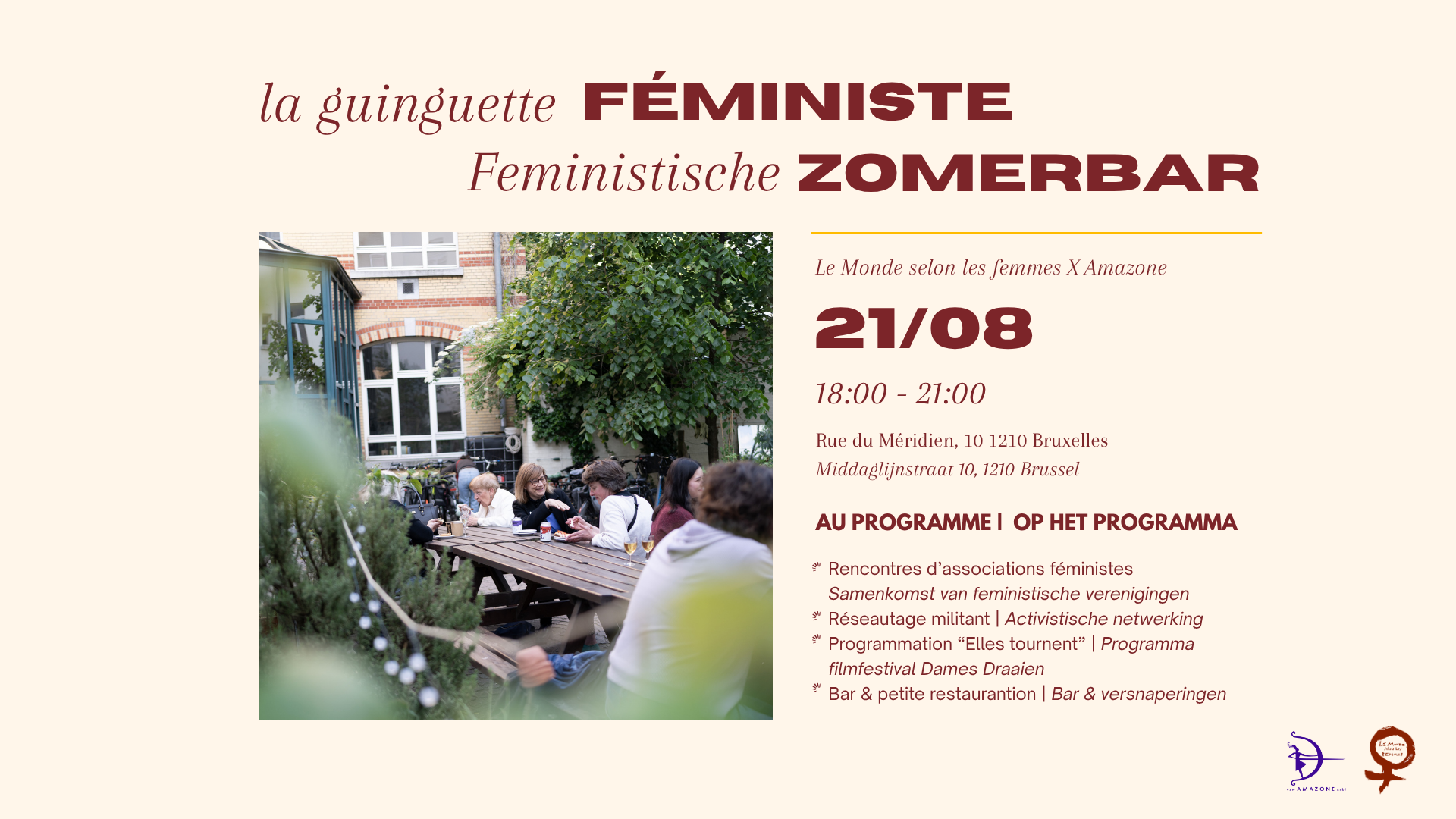 Amazone en Le Monde selon les femmes organiseren op donderdag 21 augustus vanaf 18u een feministische zomerbar in de tuin van Amazone 🥳.