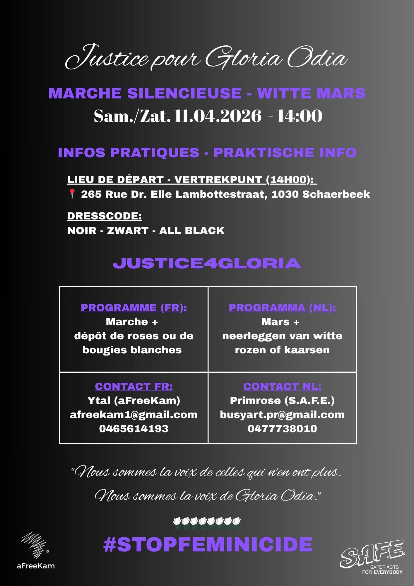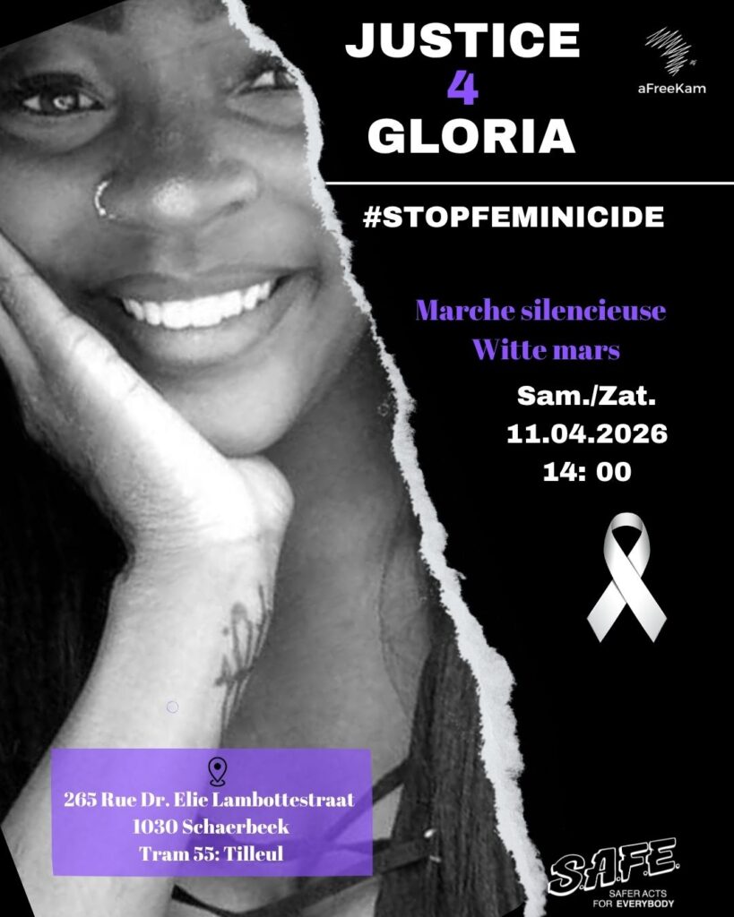 Face à cette tragédie, la famille de Gloria et ses proches appellent chaque citoyen.ne, organisation féministe, oeuvrant en faveur des droits humains à se mobiliser lors d’une marche silencieuse qui se tiendra le samedi 11 avril 2026, à 14h, à Bruxelles.