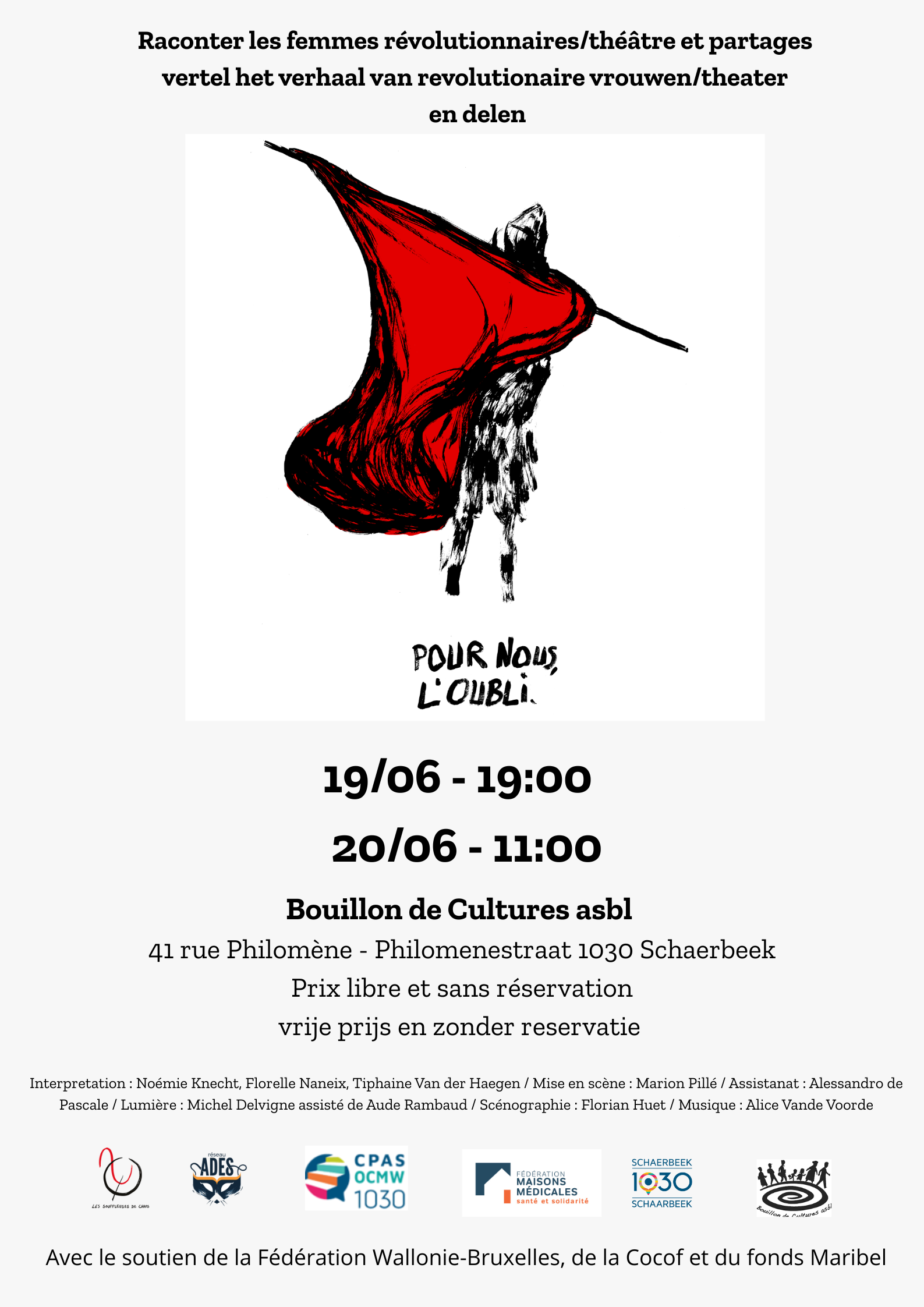 Bouillon de Cultures, la Maison des femmes de Schaerbeek, le programme de prévention urbaine de la commune de Schaerbeek, le SPS du CPAS de Schaerbeek, le réseau ADES et la fédération des Maisons médicales ont le plaisir de vous proposer la pièce de théâtre Pour nous, l’oubli.