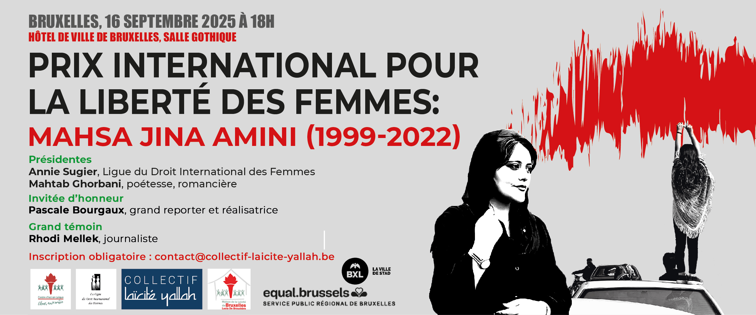 Le Collectif Laïcité Yallah ainsi que ses partenaires : La Ligue du Droit International des Femmes (LDIF), La Maison de la Laïcité de Bruxelles Lucia de Brouckère (MLLdeB), Le Centre d’Action Laïque (CAL) vous convient à la cérémonie de remise du Prix International pour la Liberté des Femmes, Mahsa Jina Amini (première édition), le 16 septembre 2025 à 18h à l’Hôtel de Ville de Bruxelles (Salle Gothique), sous la présidence de Annie Sugier, physicienne et essayiste, présidente de (LDIF) et Mahtab Ghorbani, poétesse et romancière iranienne en exil, avec la participation de notre invitée d’honneur, Pascale Bourgaux, grand reporter et réalisatrice.