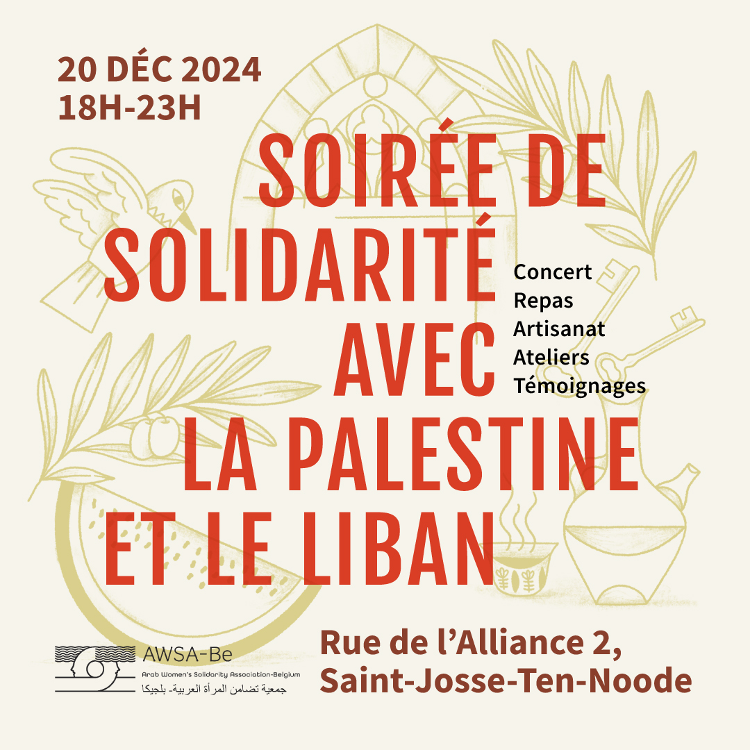 Vendredi 20 décembre, AWSA-Be (Arab Women’s Solidarity Association – Belgium) et Amel Jem3 vous invitent à une soirée de solidarité pour la Palestine et le Liban.