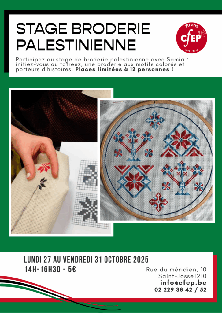 Le CFEP organise, avec Samia, brodeuse palestinienne, un stage pendant la deuxième semaine des vacances scolaires, du lundi 27 au vendredi 31 octobre, de 14h à 16h30 dans la maison Amazone.
